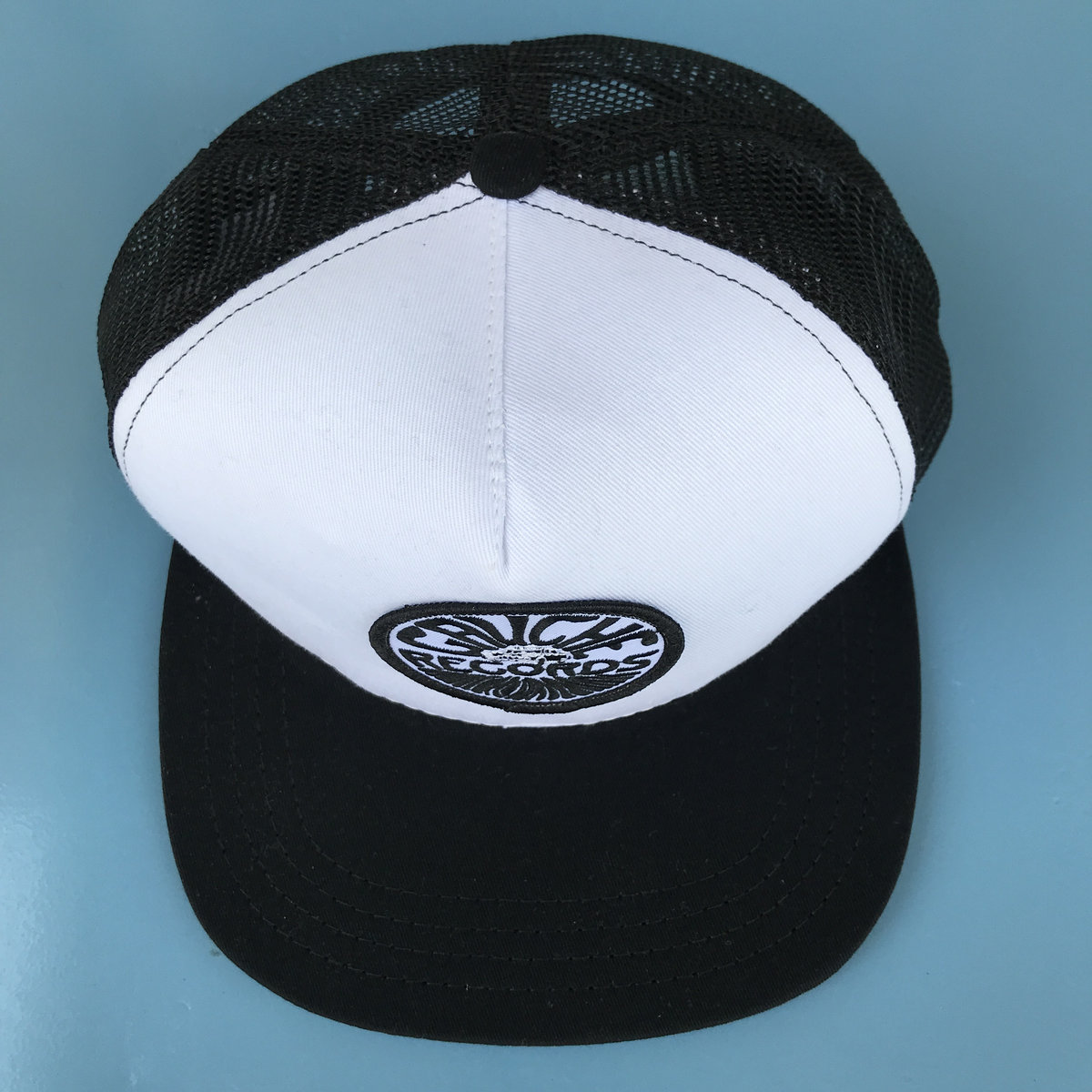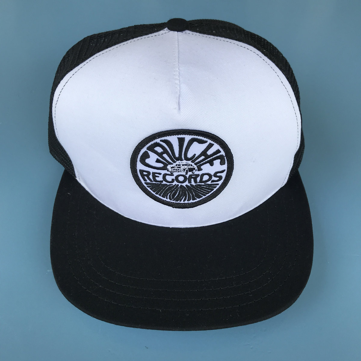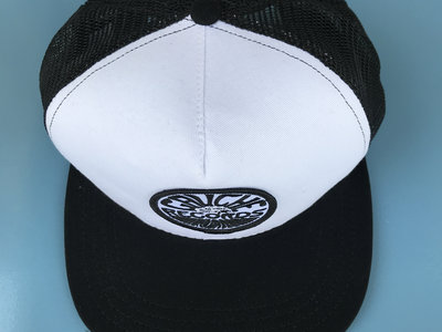 White fabric with black mesh trucker hat with patch 'Taxi Gauche Records'. Made in USA. Snapback, one size fits all.